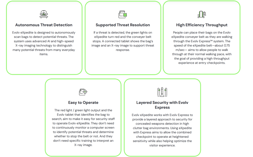 Evolv eXpedite is designed to autonomously scan the bags on the conveyer belt to detect potential threats. The system uses advanced AI and high-speed x-ray imaging technology to