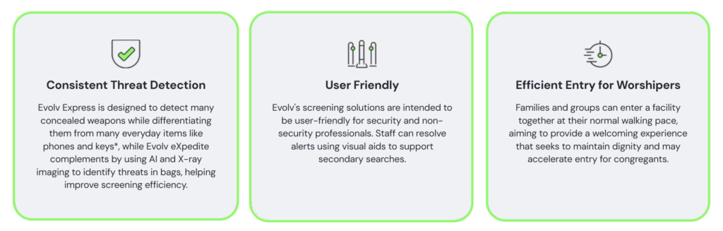 Temples, churches, mosques, synagogues, and other sacred spaces offer comfort, connection, and reflection. Evolv provides solutions to help make these environments safe and welcoming. We’re driven to help organizations identify resources, including funding opportunities, to support these efforts.