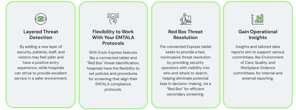 Advanced Security Screening to Support the Patient, Visitor, and Staff Experience. Evolv provides a layered approach to physical security—aiming to create an EMTALA-compliant experience for patients, staff, and visitors.