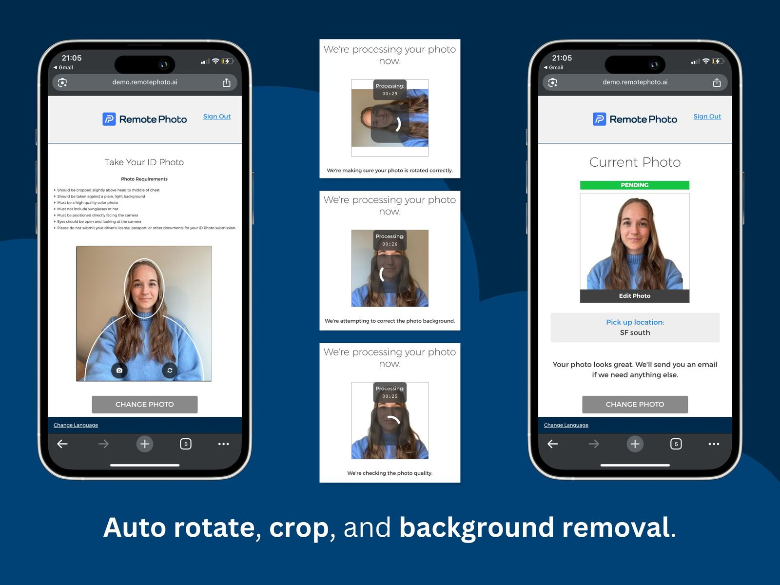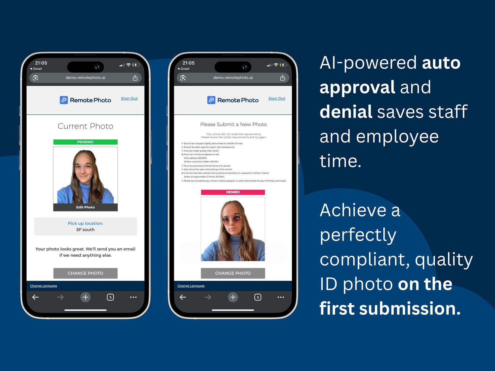 RemotePhoto automates the collection, validation, and approval of ID photos using intelligent, real-time feedback. Cardholders can submit compliant photos from any device, while administrators benefit from faster processing, consistent image quality, and seamless integration with credentialing systems. The result is a streamlined, secure, and user-friendly ID photo submission experience that saves time, reduces costs, and scales effortlessly. SEE DEMO BELOW
